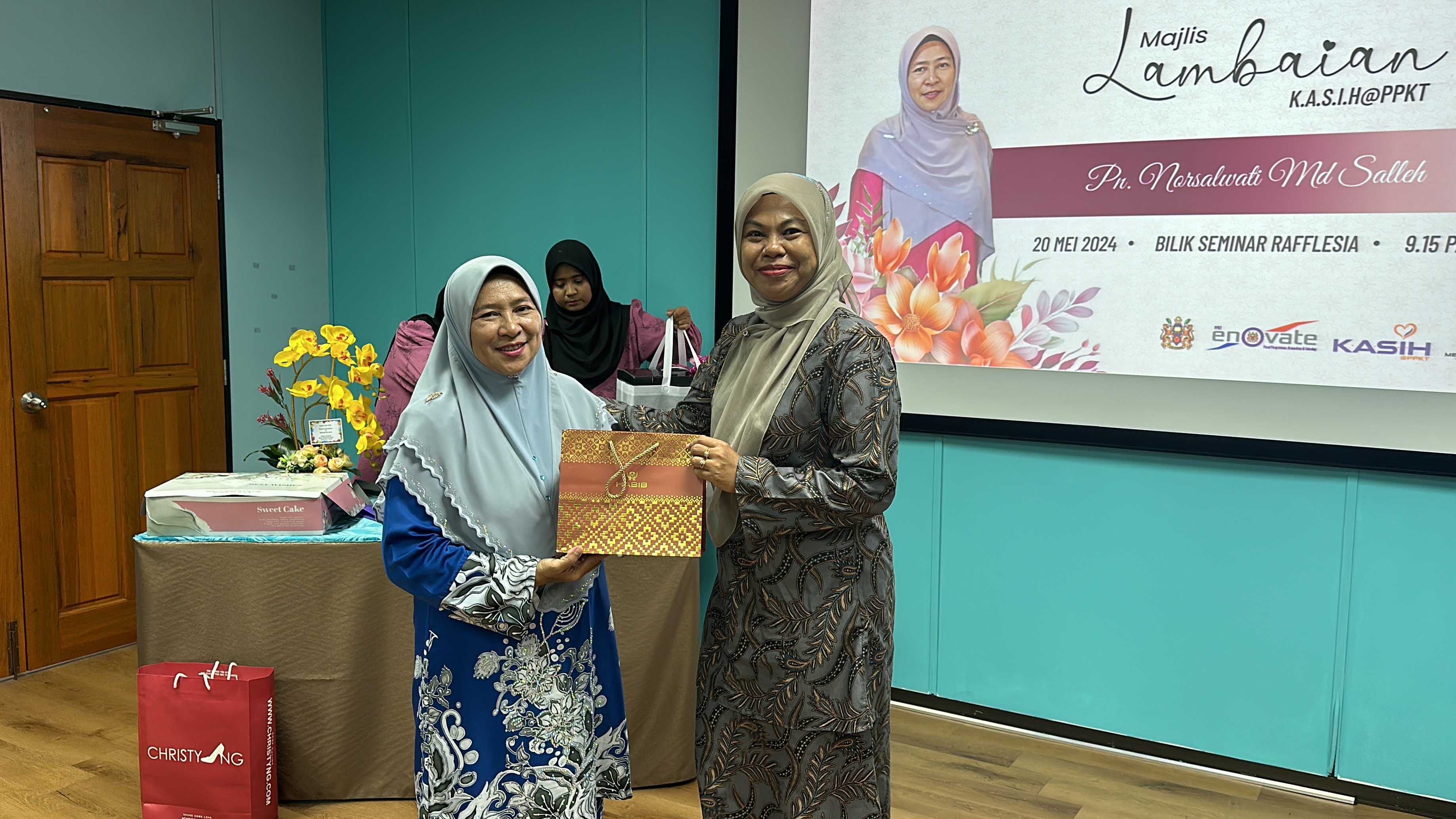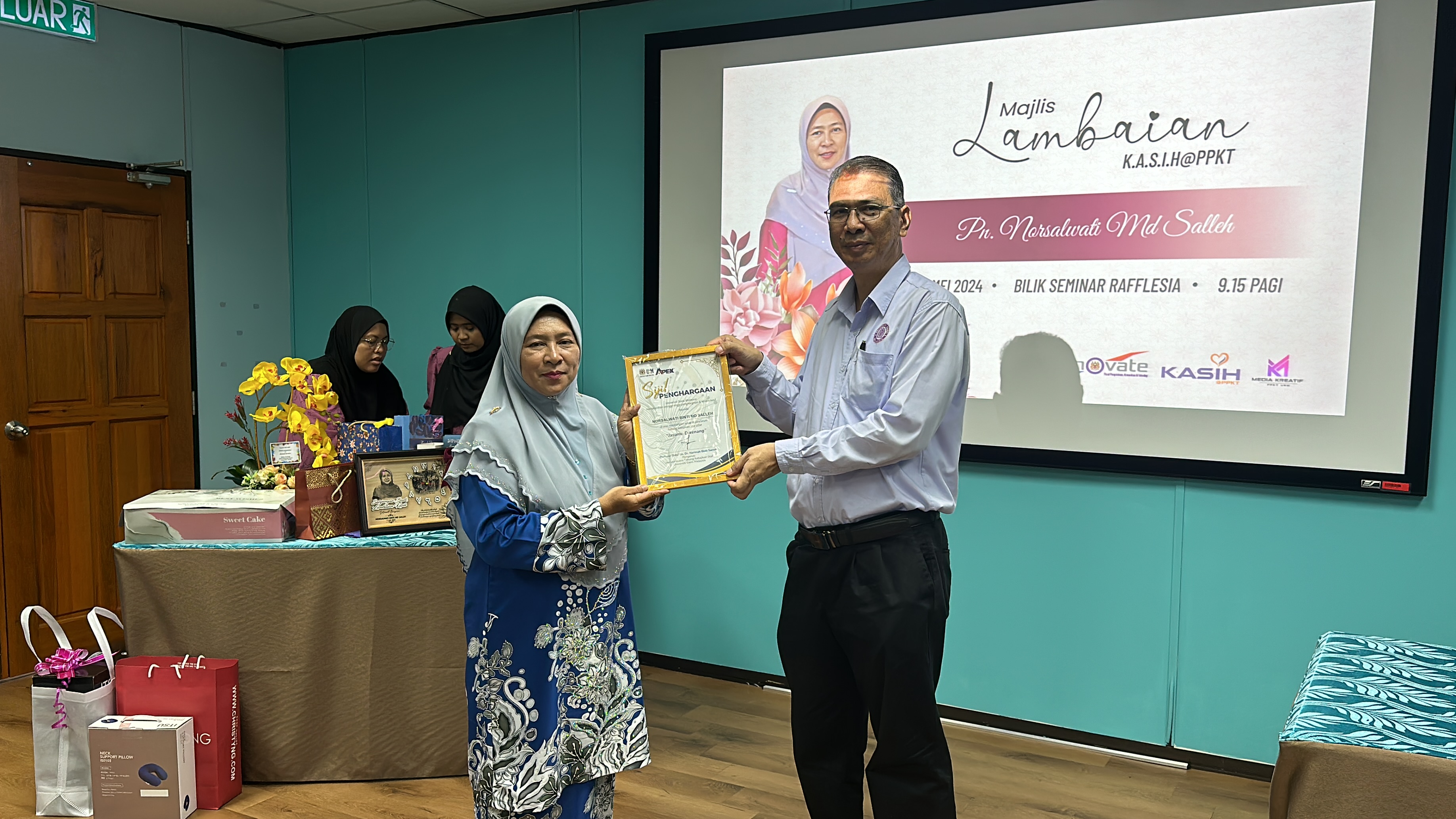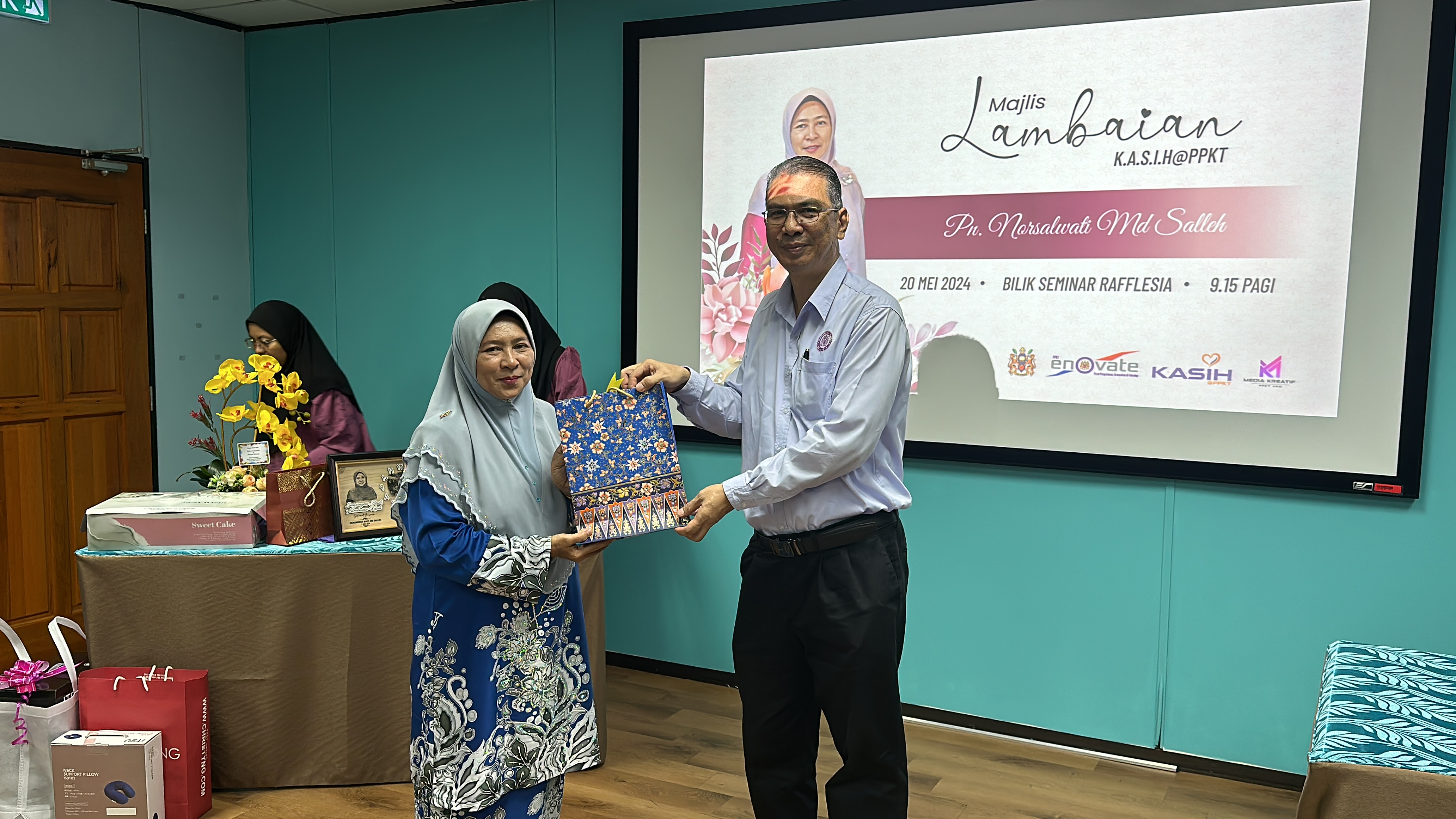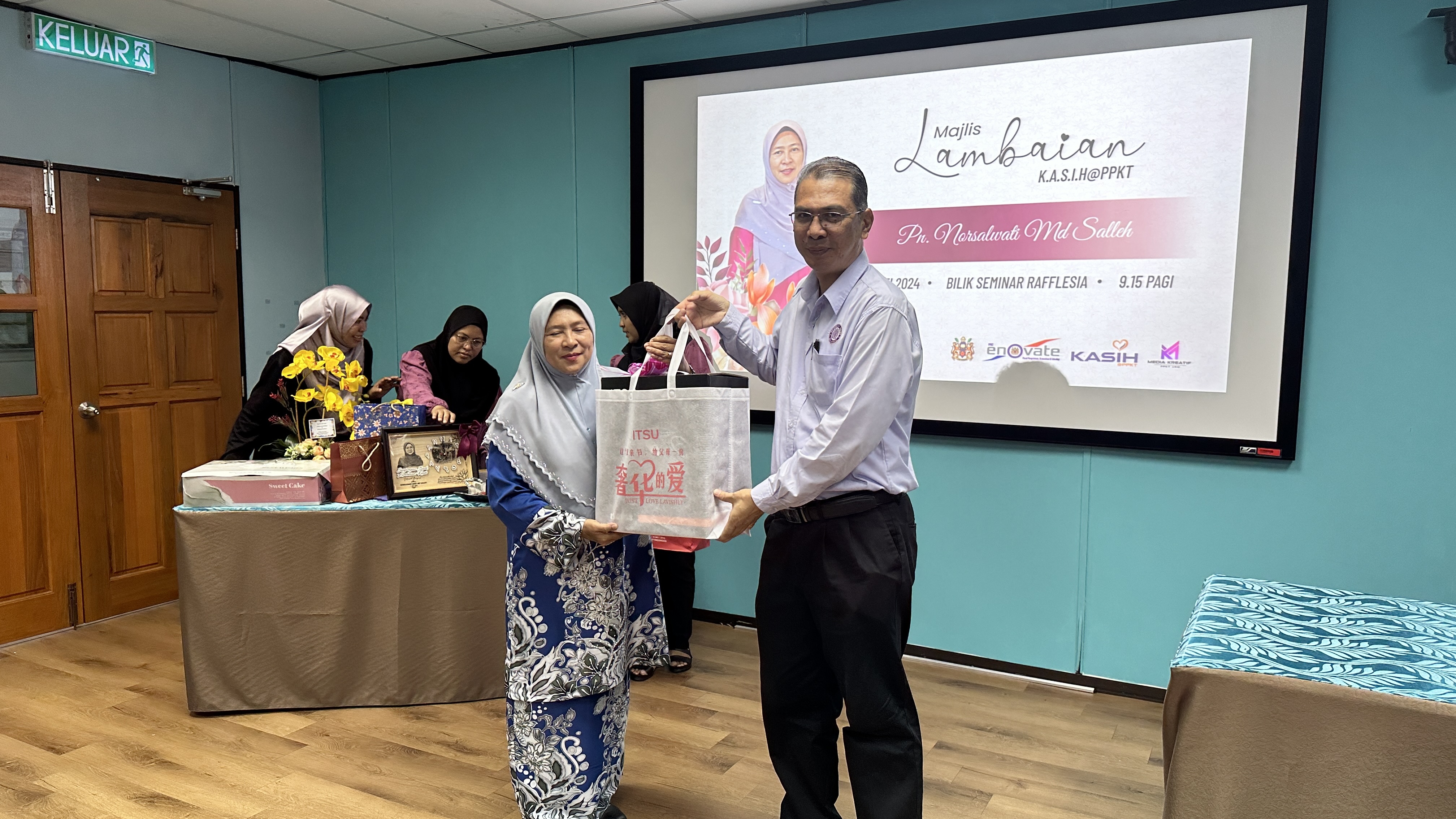 Majlis diteruskan dengan penyampaian hadiah dan cenderahati kepada Kak Nor dari staf-staf PPKT dan acara potong kek tanda perpisahan. Majlis berakhir dengan jamuan makan pagi.