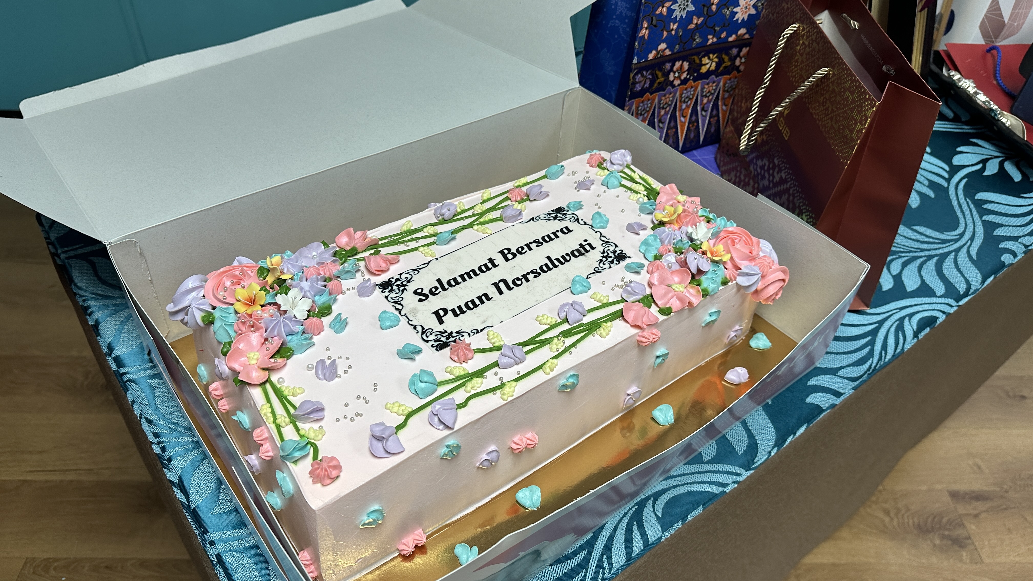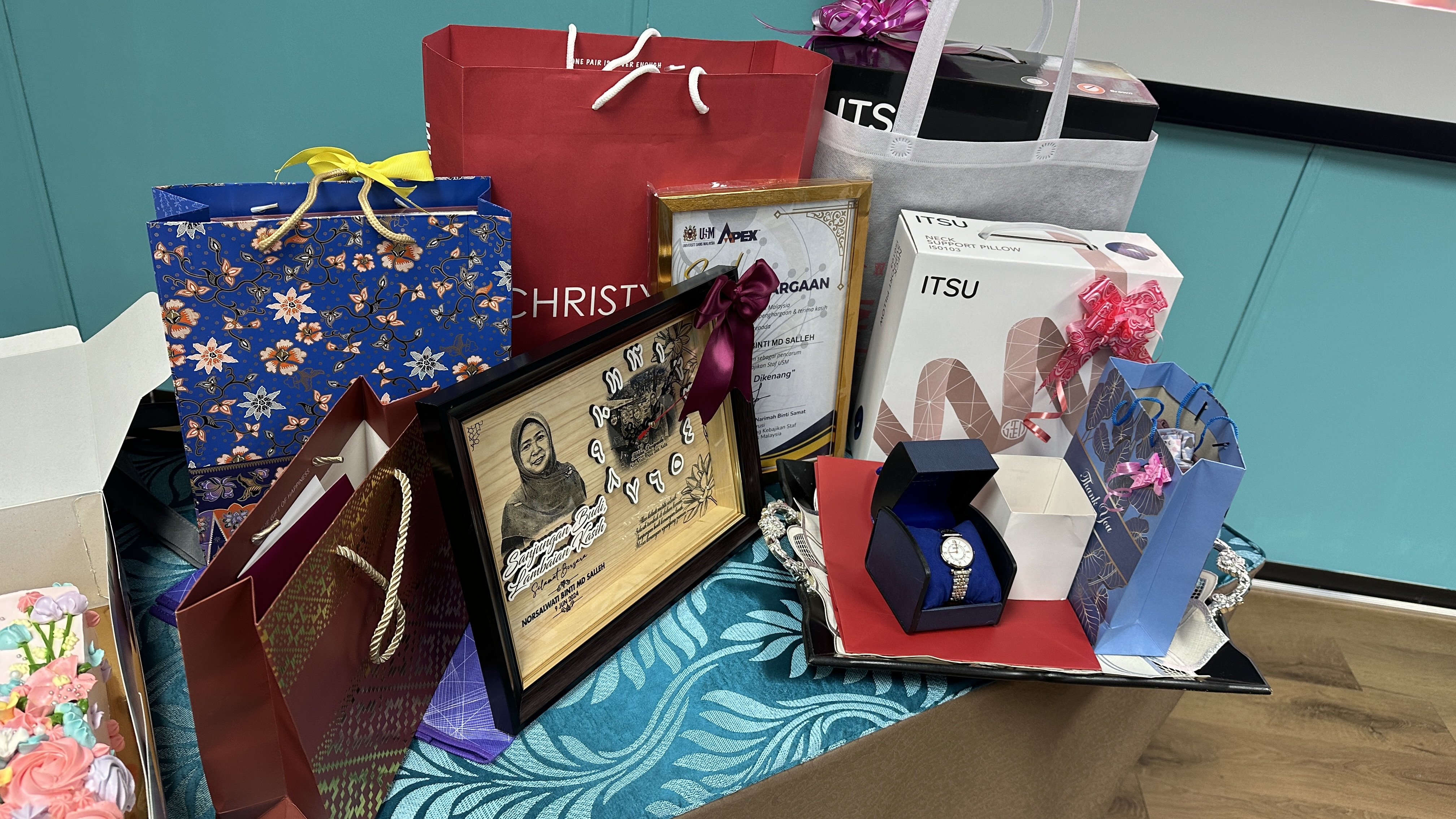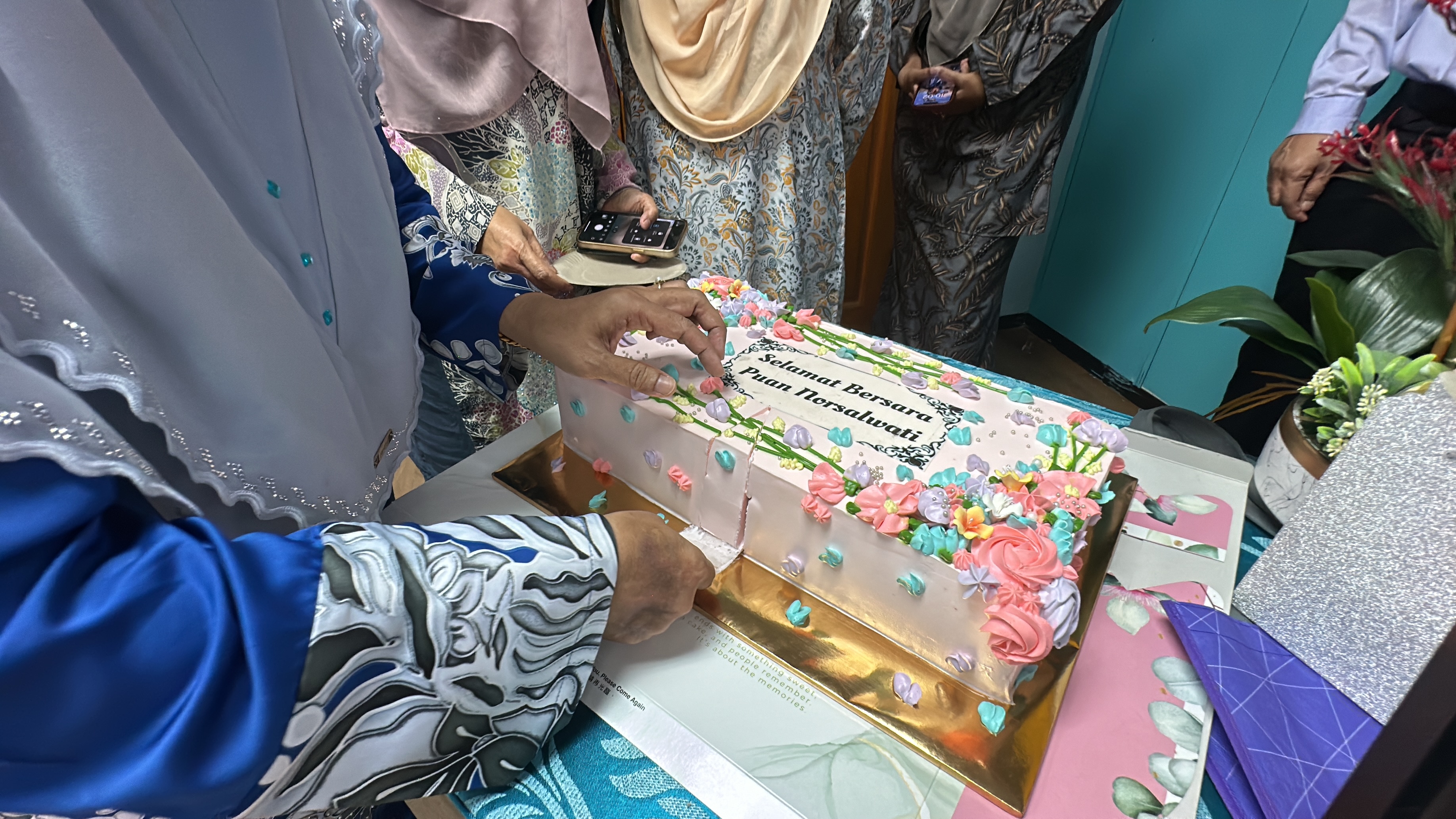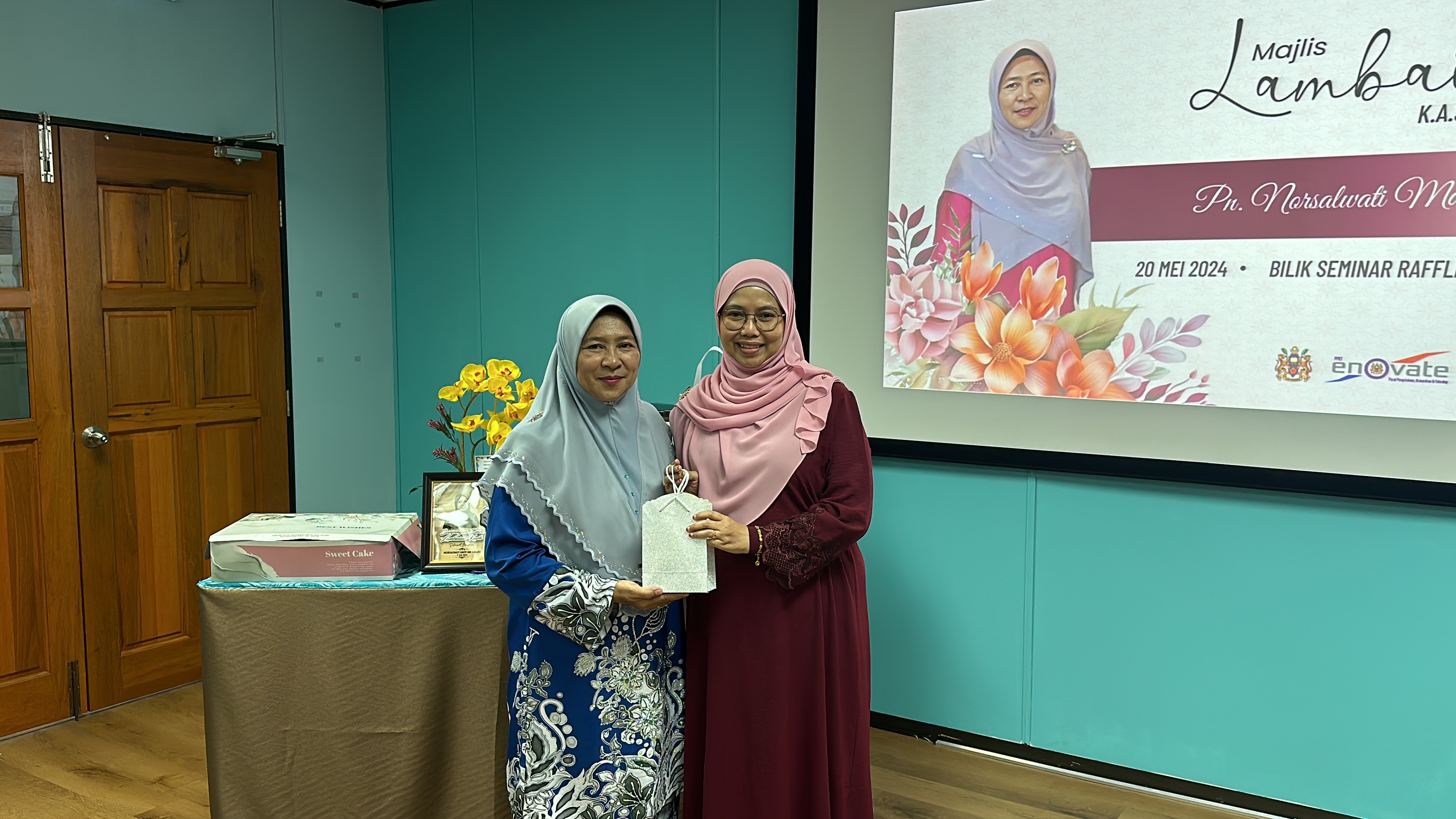 Majlis diteruskan dengan penyampaian hadiah dan cenderahati kepada Kak Nor dari staf-staf PPKT dan acara potong kek tanda perpisahan. Majlis berakhir dengan jamuan makan pagi.