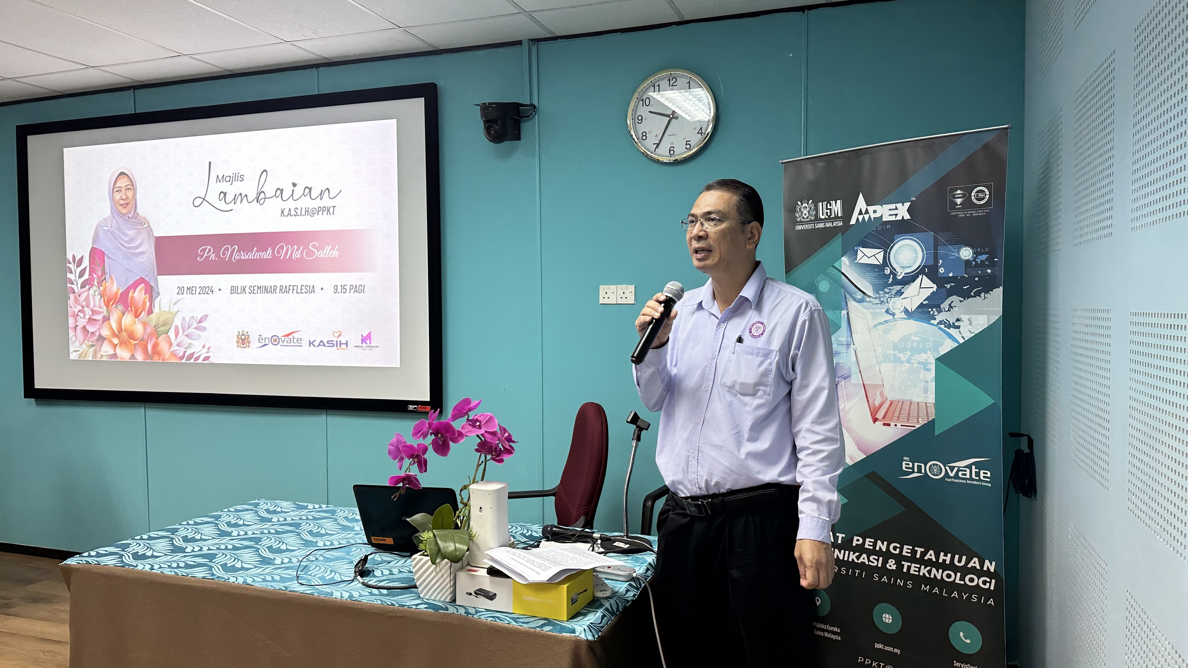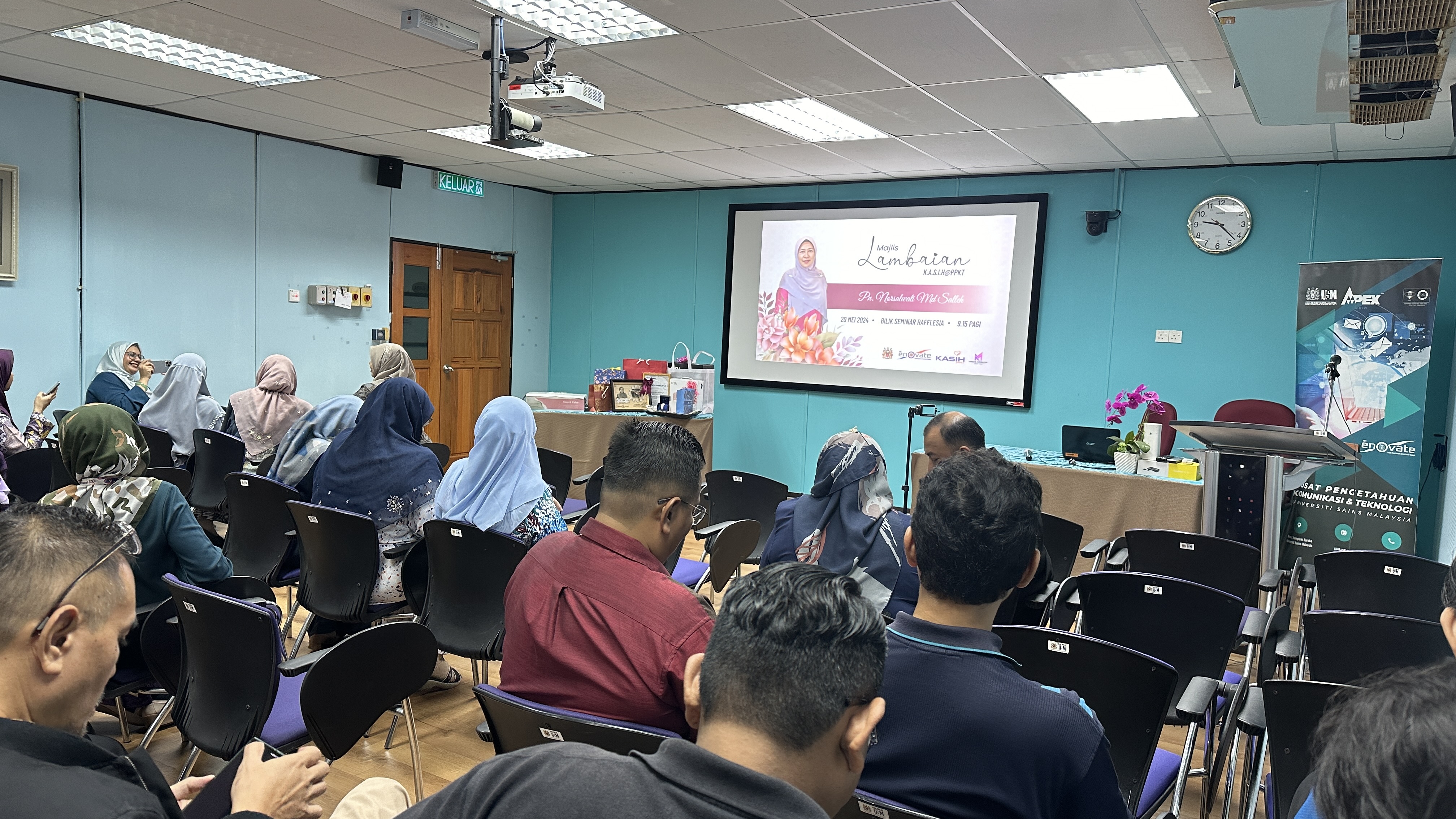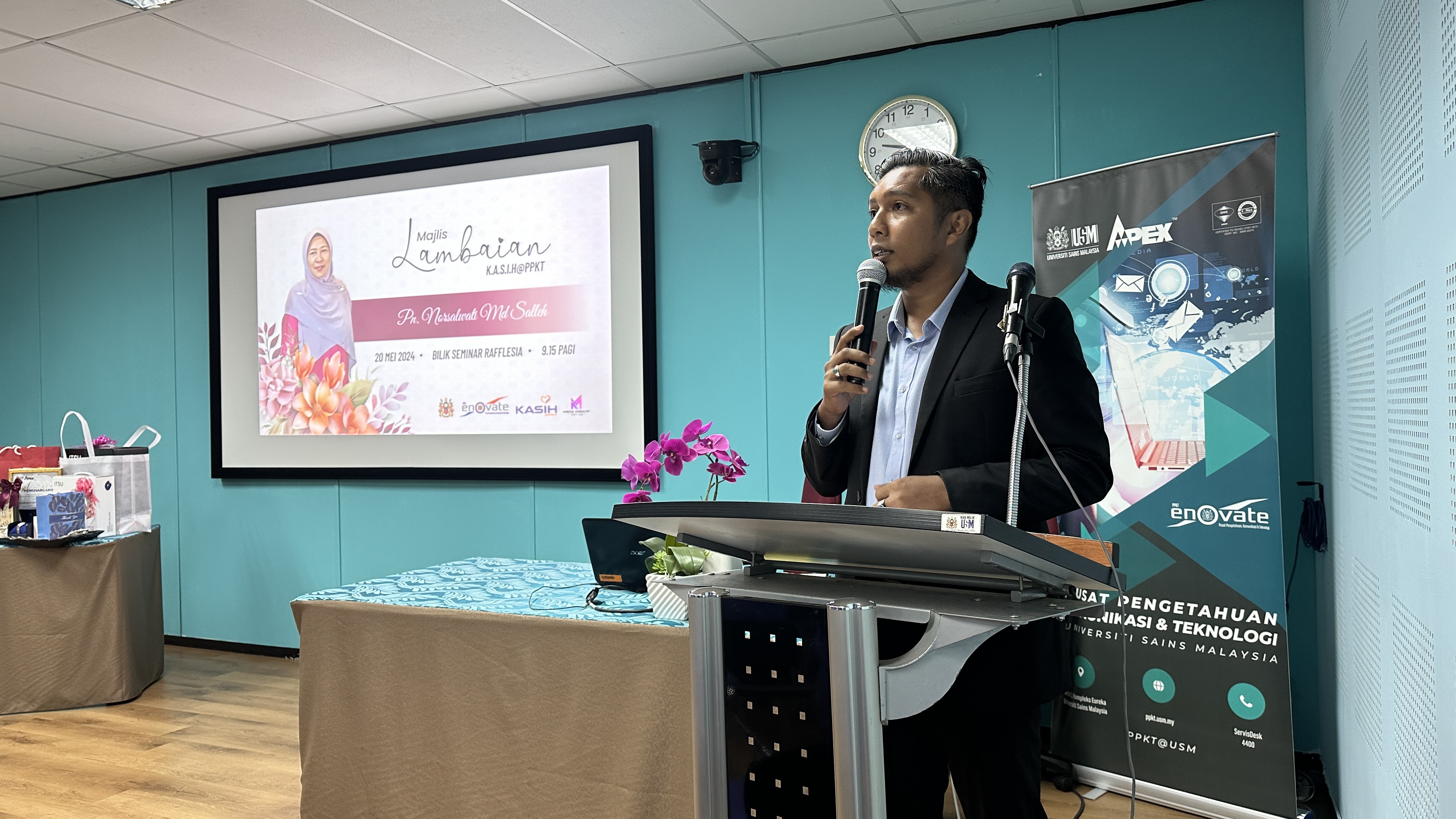 Majlis dimulai dengan kata-kata aluan pengacara majlis, En. Afzan dan seterusnya ucapan penghargaan oleh Pn. Zaiyana selaku Presiden Kelab PPKT. Majlis diteruskan lagi dengan amanat penghargaan dari Pengarah PPKT yang disampaikan oleh Timbalan Pengarah (Korporat & Sokongan ICT) yang juga Pengerusi K.A.S.I.H@PPKT, En. Adnan. Seterusnya adalah tayangan multimedia perjalanan kerjaya Kak Nor di USM dan majlis diteruskan dengan menjemput Kak Nor untuk memberikan sepatah dua kata serta bercerita tentang pengalaman beliau sepanjang berkhidmat di USM.