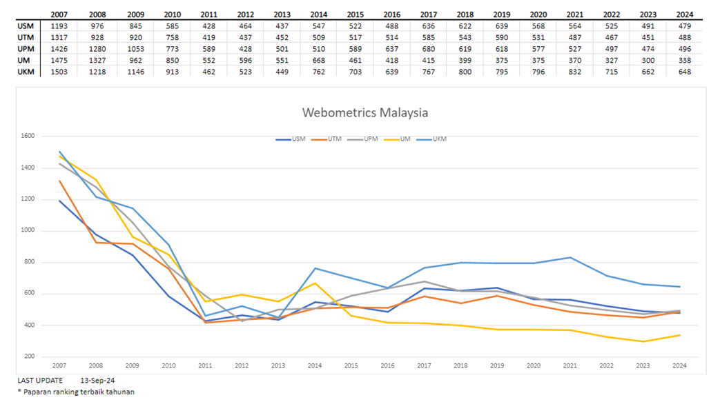 Universiti Sains Malaysia (USM) mempamerkan peningkatan yang signifikan dalam penarafan Webometrics atau Webometrics Ranking of World Universities yang telah diumumkan pada edisi Julai 2024. USM berjaya memperbaiki kedudukannya dengan menaiki tangga ke-2 di Malaysia dan ke-479 di peringkat dunia selepas Universiti Malaya (UM). Pada penarafan sebelum ini, USM berada di tangga ke-4 di Malaysia selepas UM, UTM (Universiti Teknologi Malaysia) dan UPM (Universiti Putra Malaysia), dan ke-491 di peringkat dunia. Sejak diperkenalkan pada tahun 2007, USM telah menunjukkan prestasi cemerlang dalam penarafan Webometrics. Keupayaan dan kemampuan USM berada pada kedudukan tersebut mencerminkan keupayaan Universiti ini untuk terus kekal bersaing secara kompetitif dan berada di tahap yang sama dengan institusi pendidikan tinggi ternama dunia.