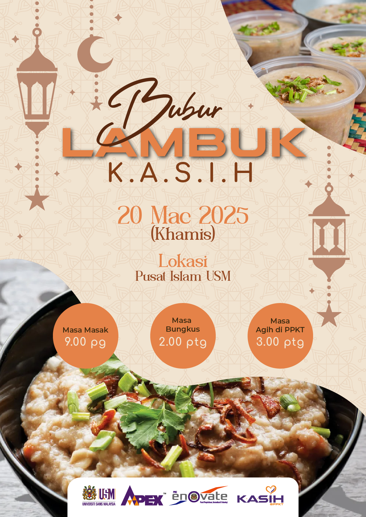 PULAU PINANG, 20 Mac 2025 – Pusat Pengetahuan, Komunikasi dan Teknologi (PPKT) dengan kerjasama Pusat Islam Universiti Sains Malaysia (USM) telah menganjurkan Program Bubur Lambuk K.A.S.I.H@PPKT di Pusat Islam USM.